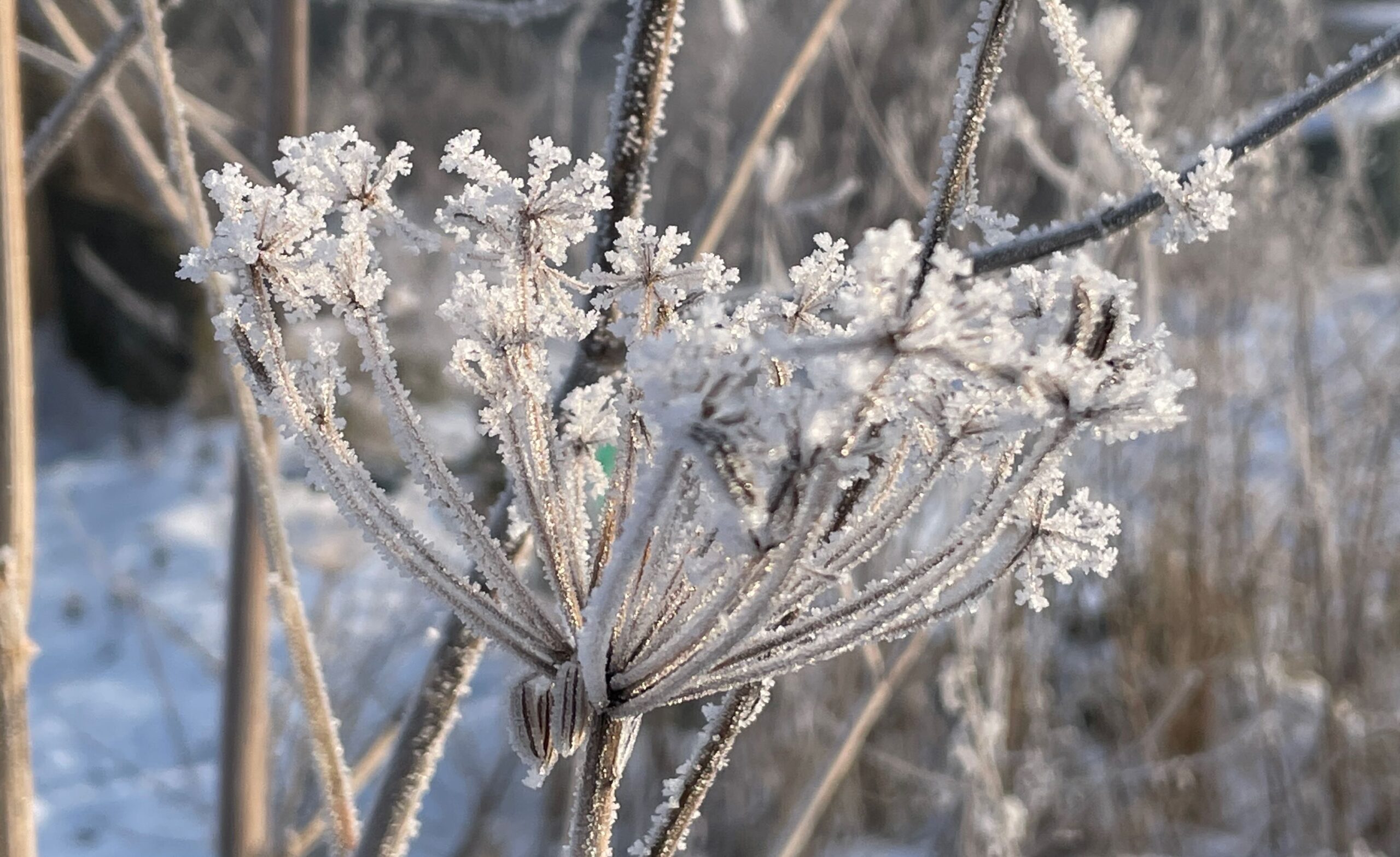 À travers cette photo d’une berce commune laissée sur pied, j’en profite pour rappeler que conserver les plantes sauvages sur pied en hiver permet non seulement de nourrir les oiseaux granivores, mais aussi d’admirer une incroyable diversité de formes de givre, aussi variées que les plantes elles-mêmes.