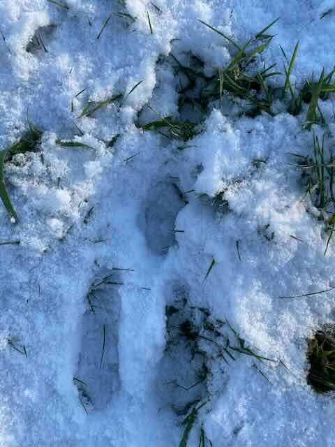 Ici, il s’agit d’empreintes de lièvre d’Europe, reconnaissables aux deux pattes arrière allongées et parallèles, tandis que les pattes avant, plus petites, sont disposées l’une devant l’autre.